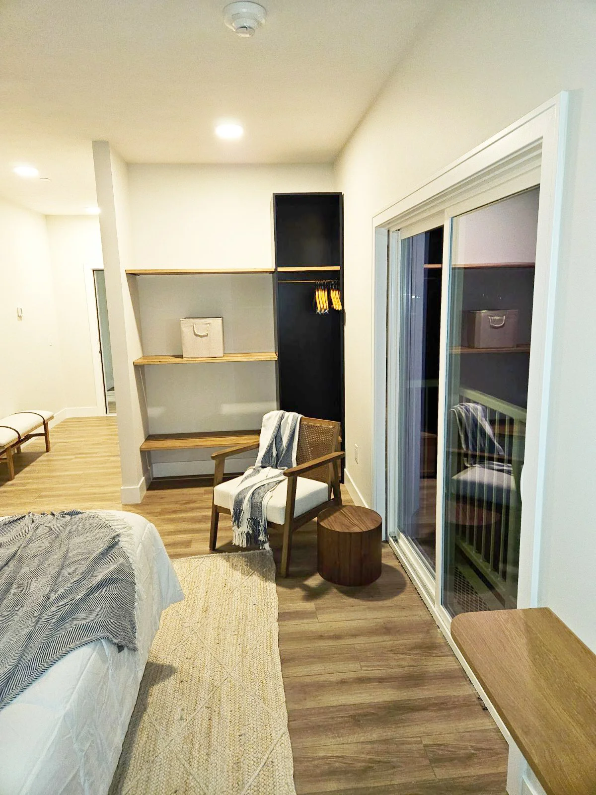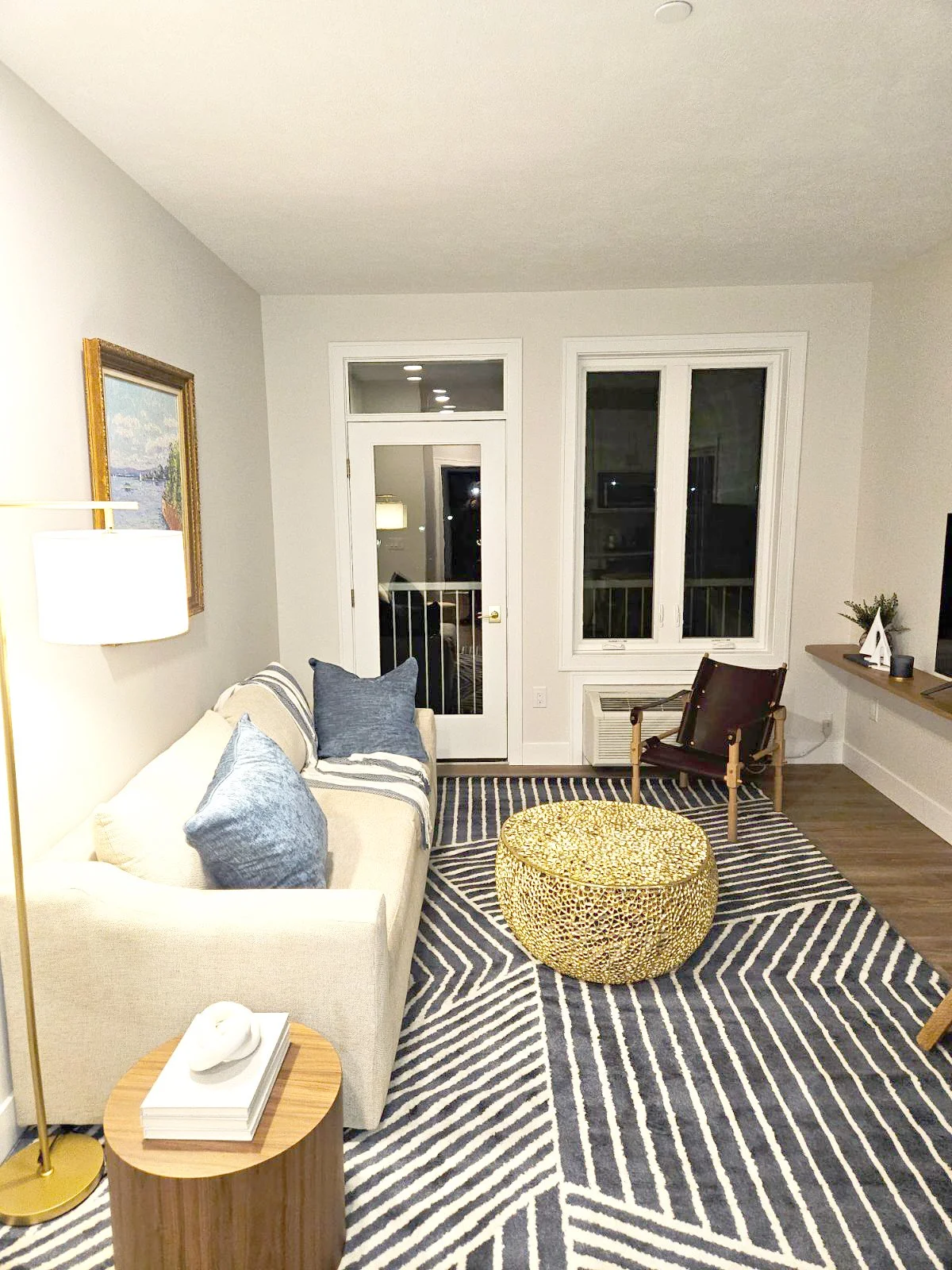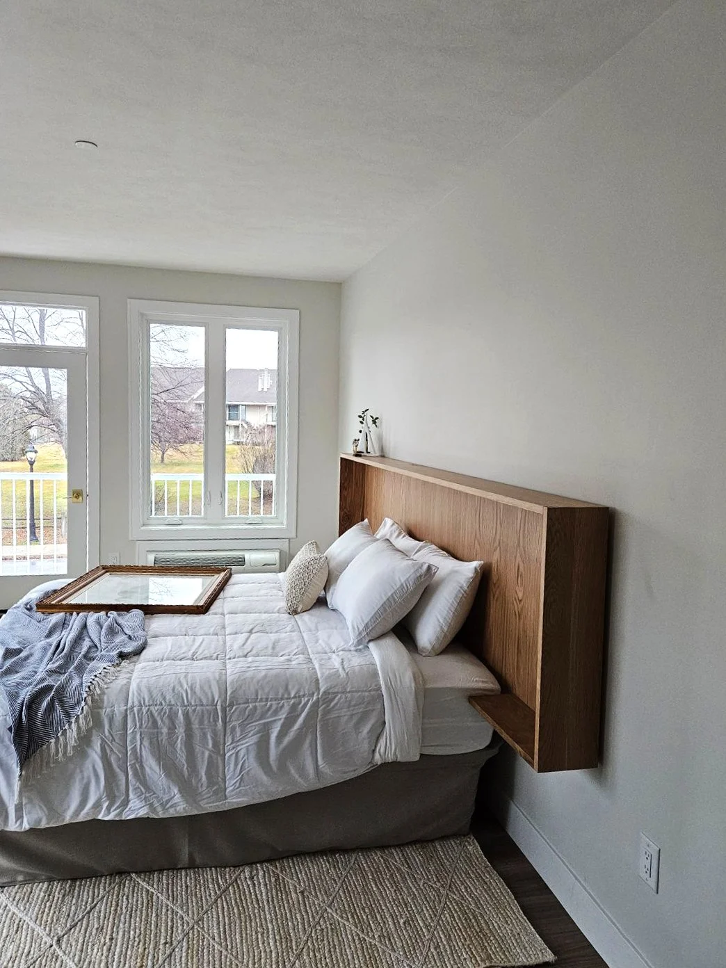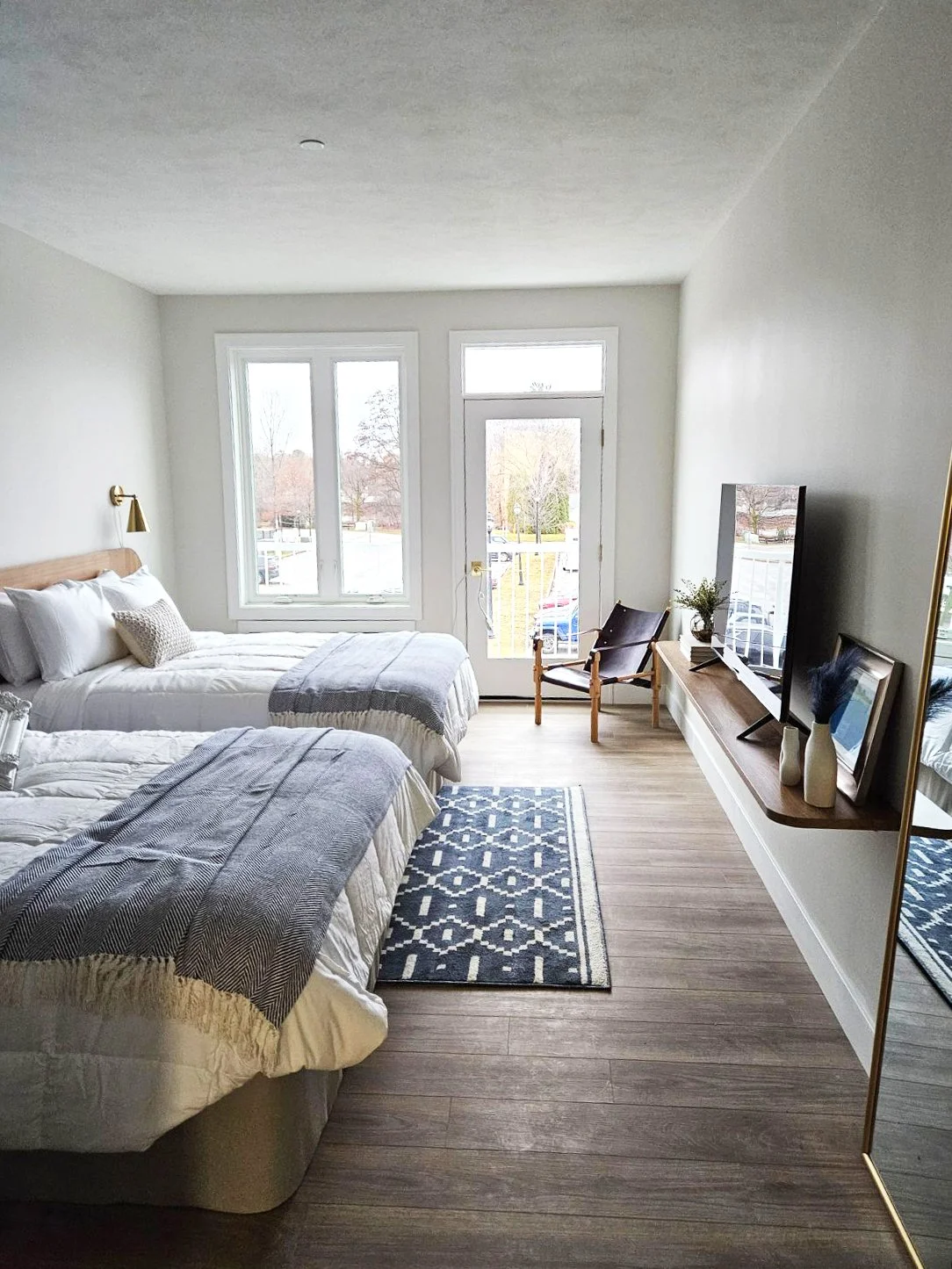 A Dexter Hotel room with a bed, white bedding, and a wooden headboard. There is a small black and white striped rug under the bed. A window with natural light is in the background, and a small kitchenette with a sink and cabinetry is on the left.