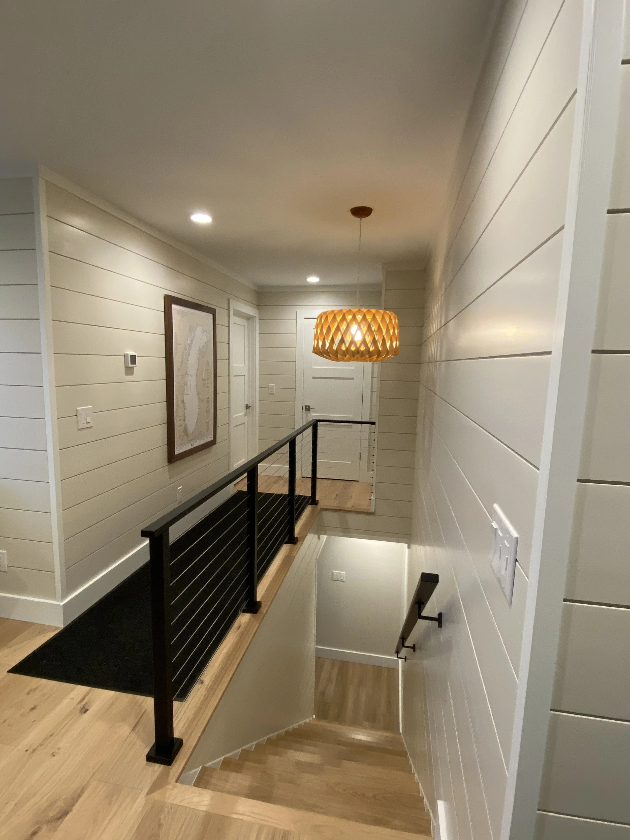 Interior view of a home with white shiplap walls, a staircase with black railing, a yellow pendant light, and hardwood floors.